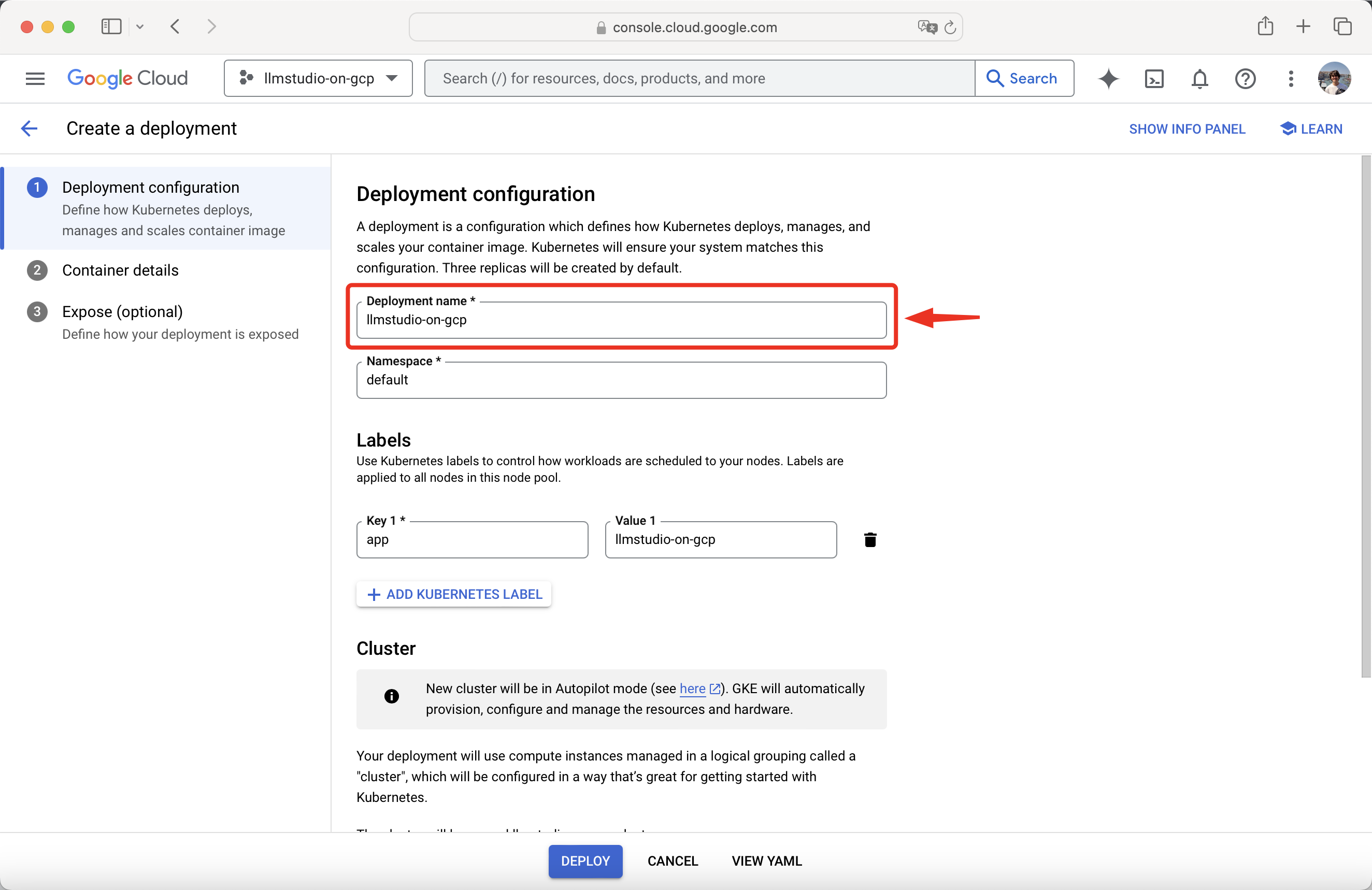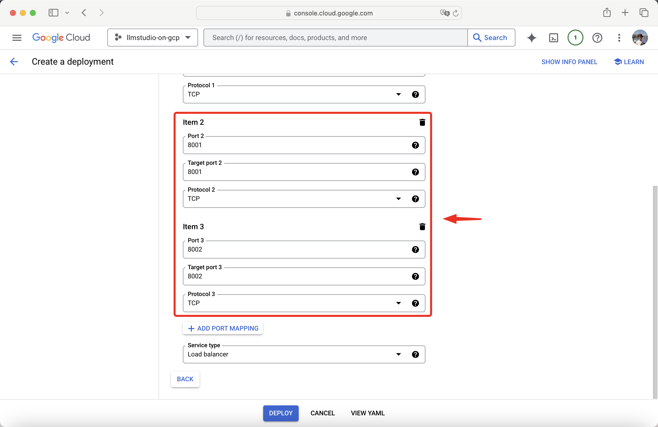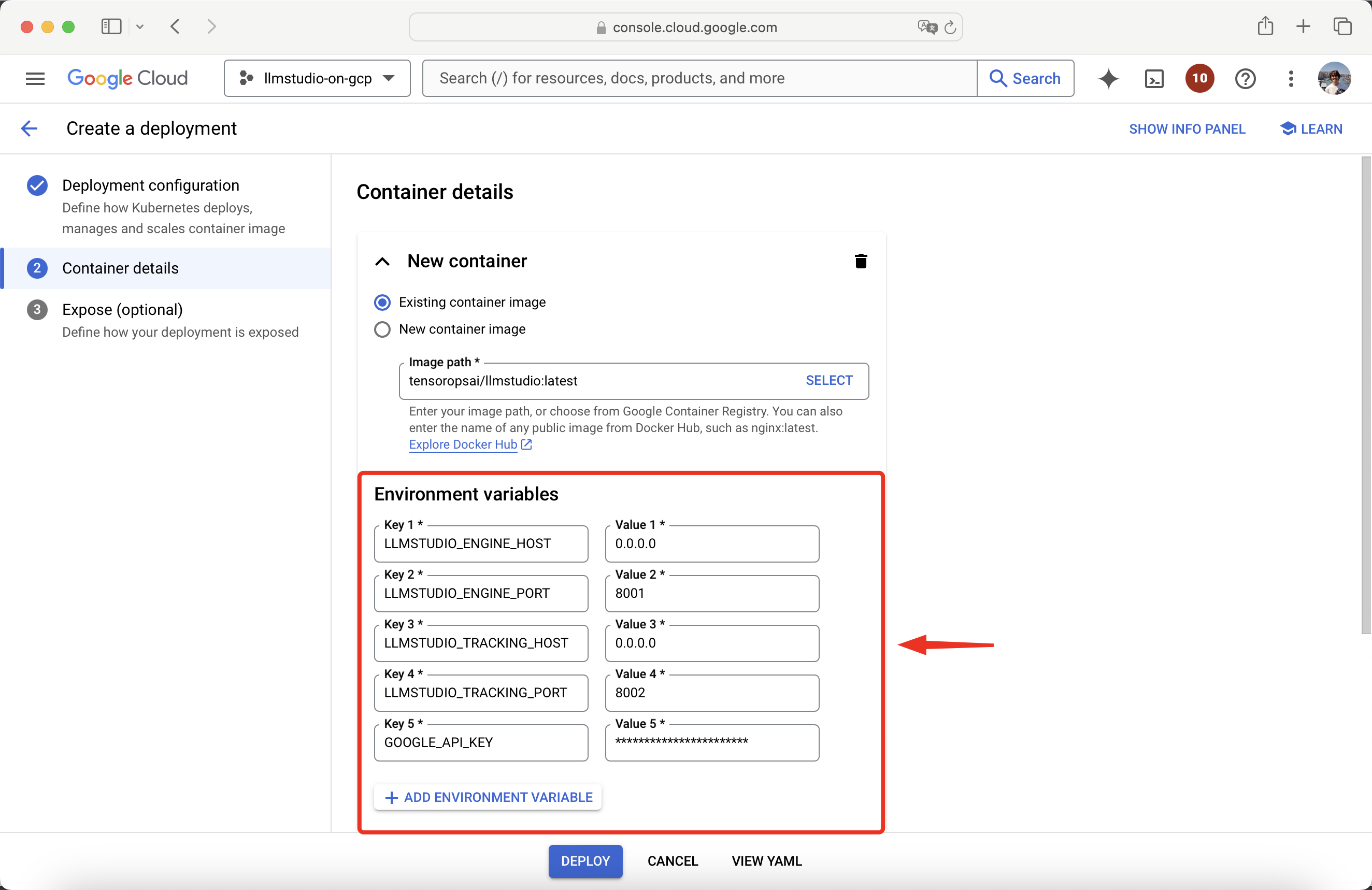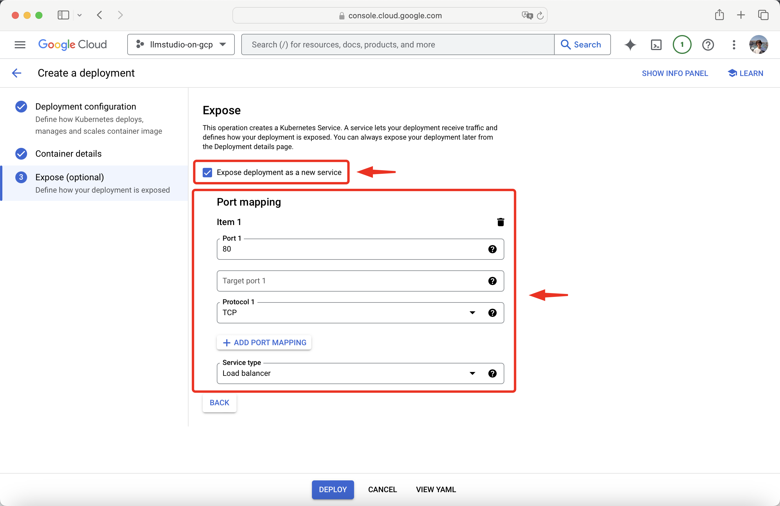 After setting up and exposing the ports, press Deploy.
