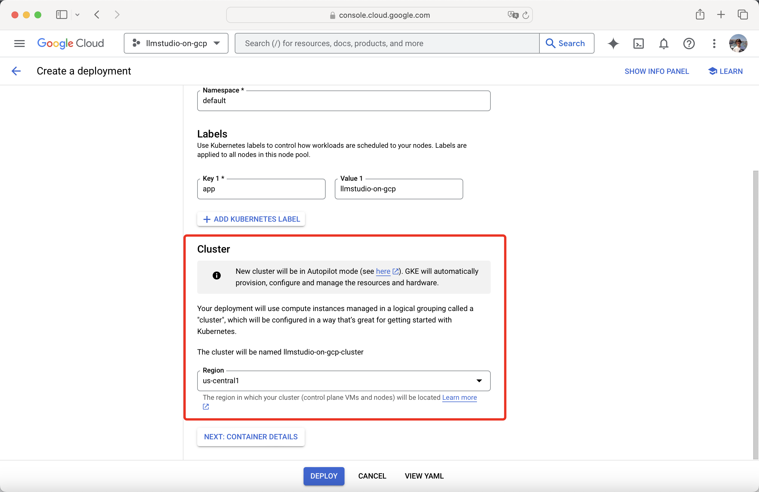Once done done with the Deployment configuration, proceed to Container details.