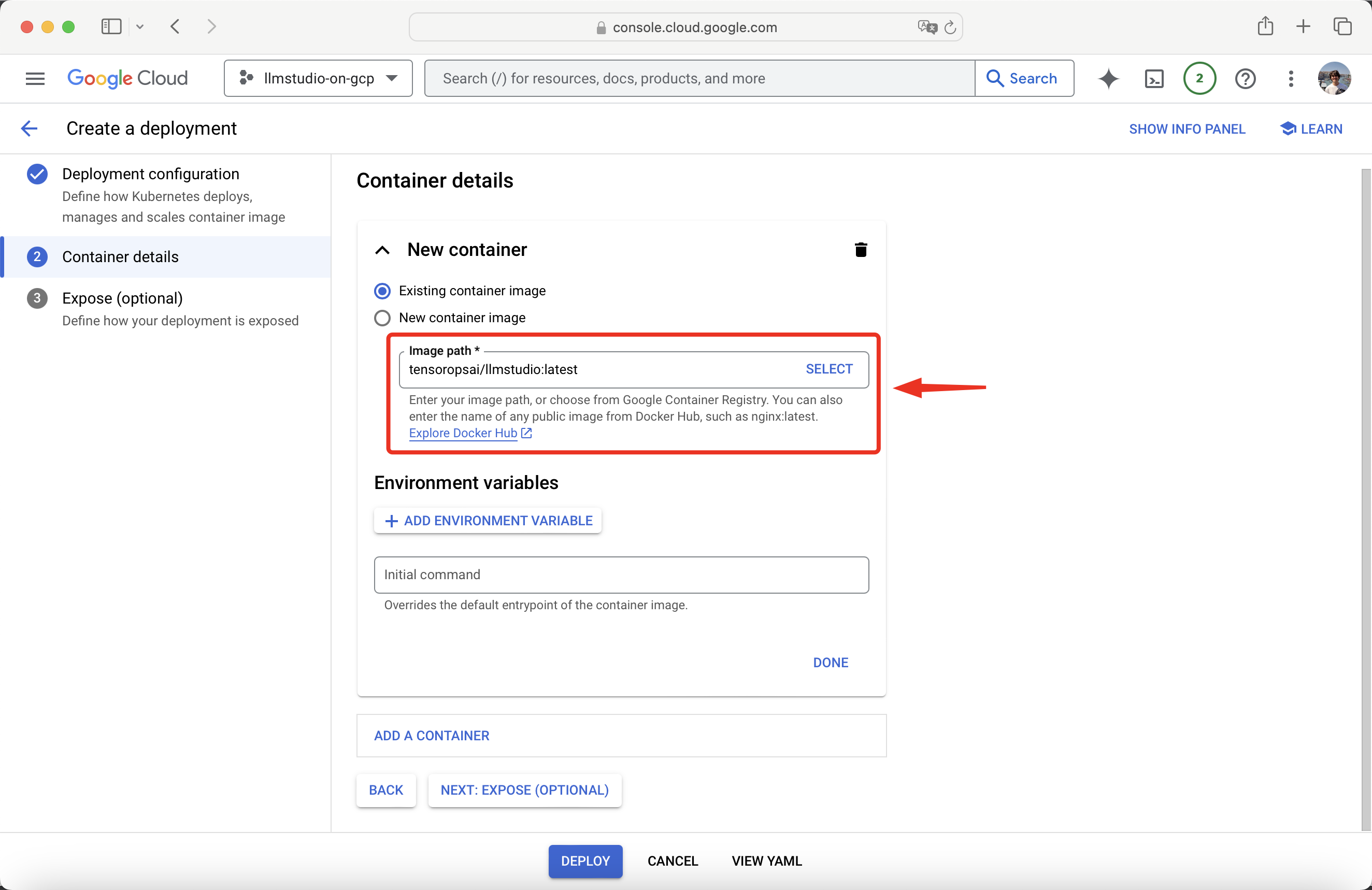 In the new container section, select Existing container image.Copy the path to LLMstudio’s image available on Docker Hub.Set it as the Image path to your container.