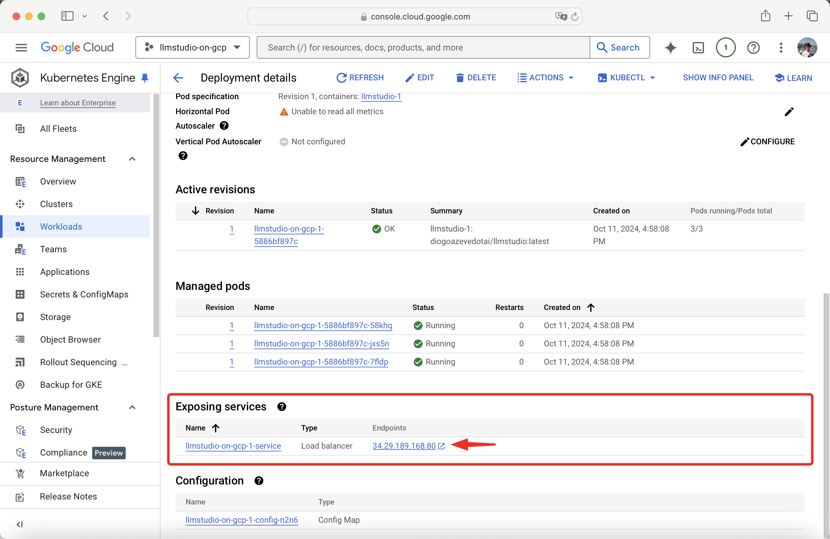 Go to your newly deployed Workload, scroll to the Exposing services section, and take note of the Host of your endpoint.